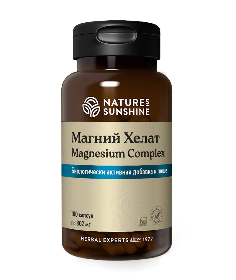 Магний – один из наиболее важных биоэлементов, в значительных количествах содержится в тканях животных и растений (хлорофилл). Магний – важнейший электролит, он является кофактором многих ферментативных реакций. Магний участвует в превращении креатинфосфата в АТФ, необходим на всех этапах синтеза белка. О дефиците магния свидетельствуют: нарушения сна, повышенная раздражительность, необъяснимая тревога, повышенная утомляемостью, спазмы икроножных мышц, у детей – синдром гиперактивности. В более тяжелых случаях отмечают повышенную подверженность стрессам, нарушение сердечного ритма, запоры, осложнение предменструального синдрома. Потребность в магнии увеличивается при потливости, частом употреблении слабительных и мочегонных, алкоголя, при больших психических и физических нагрузках (в первую очередь при стрессах и у спортсменов). В каждой капсуле БАД Магний Хелат содержится 100 мг чистого магния, который находится в хелатном соединении с органическими кислотами яблочной и лимонной кислотой, что обеспечивает максимальное усвоение этого макроэлемента.